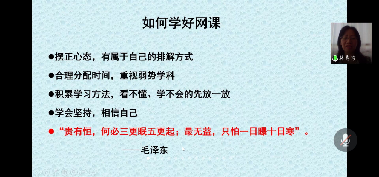 班主任韩秀珍老师亲切地向同学们展示了校园春景。看着屏幕上一簇簇绽放的鲜艳花朵,枝头上茂盛的绿叶,大家心中不禁生起了对校园的怀念之情。韩秀珍老师还传授了网课学习的方法,为同学们备考期末加油鼓劲,希望每一位同学重视每一节课,课前课后认真预习复习,攻克每一个知识点。