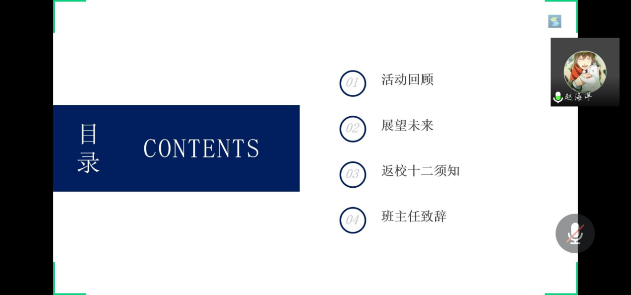 会议开始,班长赵海洋对本学期开展的活动进行了回顾与总结并布置了近期班级工作的重点,他提出对班级同学的几点要求,表达了对同学们做好居家学习的殷切期望。赵海洋还抽查了同学们对《返校复学应知应会》的掌握情况,同学们认真地背出返校十二须知。