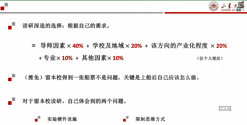 随后推免至北京协和医学院药物研究所药理学方向直博生的王旭升同学也分享了保研经历。王旭升认为影响选择的四大因素是:学校、专业、导师、城市,分别就这四个方面进行了详细的解说,如从学科评估中选择合适的学校,提前选择导师等。他还分别讲解了选择夏令营、联系导师、九月复试的具体注意事项,并分享了优秀学习平台与学习资源。