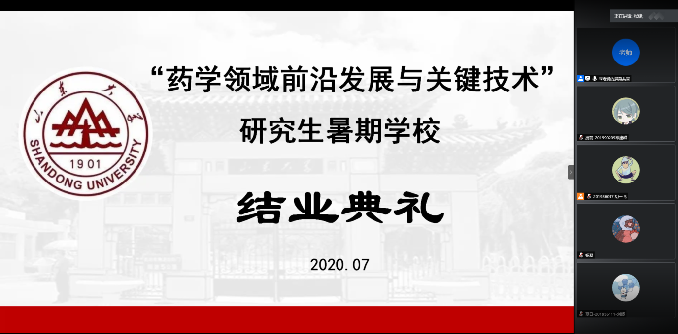 2020年7月17日下午,为期三周的“药物领域前沿发展与关键技术”研究生暑期学校顺利落下帷幕。结业典礼由伟德国际1946官网副经理张建主持,伟德国际1946官网经理刘新泳出席结业典礼并作总结讲话。