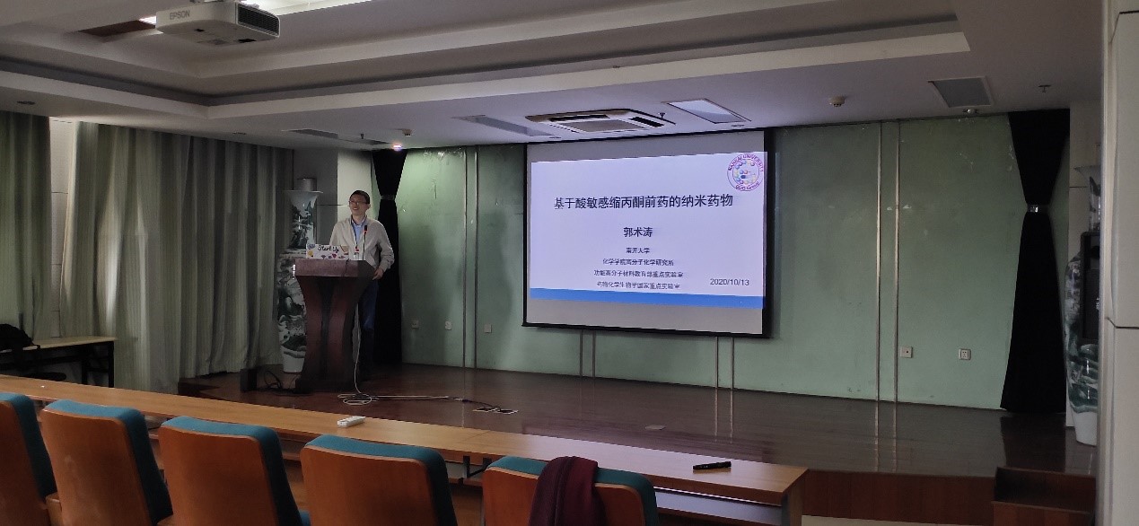 在学术报告中,郭术涛以“基于酸敏感缩丙酮纳米药物”为题,介绍了纳米药物亟待解决的两个短板,并提出了以缩丙酮为前药linker的方案,这为现有问题提供了新的思路。此外,郭术涛还介绍了其最近部分科研成果,包括“地塞米松缩丙酮前药抗炎纳米药物”:以缩丙酮为linker,给前药分子赋予了pH敏感性;“长效制剂治疗慢性病”:将地塞米松结晶送至关节炎症部位,并建立了随炎症程度改变而变化的释药速率的给药体系;“抗肿瘤糖苷前药”:一种自组装的纳米药物,因其两亲性而更适宜应用于人体;“雌二醇-聚缩酮偶合物”:通过制备了一种多孔微球结构,因而具有了良好的释药性;“药物衍生异丙烯基醚”:开发了聚原酸酯为药物载体,达到在酸性环境中突释的效果,在改善蛋白质的胞质递送方面有优异表现。在问题交流环节,郭术涛对同学们提出的问题做了耐心的解答,并与数位老师进行了学术探讨,师生们一致认为受益匪浅。