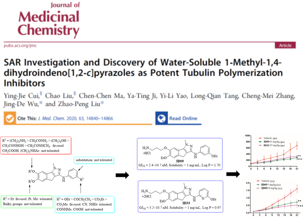 为进一步明确茚并吡唑类微管蛋白抑制剂的构效关系,提高该类化合物的水溶性,刘兆鹏教授课题组以LL01的结构为基础,对茚并吡唑6位、7位酚羟基上的取代基和3位的芳胺,进行了系统的结构修饰,合成了一系列茚并吡唑衍生物。通过微管蛋白聚合抑制实验和抗肿瘤细胞增殖活性评价,明确了茚并吡唑类微管蛋白抑制剂的构效关系,发现了一系列高活性微管蛋白抑制剂。其中,化合物ID09和ID33具有优良的水溶性(溶解度>1 mg/mL)和理想的LogP值(1.70和0.97)。ID09和ID33靶向秋水仙碱结合位点,通过抑制微管蛋白的聚合,干扰微管、微丝的形成,使肿瘤细胞周期停滞于G2/M期,并通过诱导肿瘤细胞凋亡相关蛋白PARP的裂解,活化caspase-3,诱导肿瘤细胞的凋亡。ID09和ID33对多种肿瘤细胞,包括紫杉醇耐药的肿瘤细胞,具有优良的抗增殖活性,GI50在纳摩尔水平,活性优于紫杉醇、CA-4或与其相当。在初步毒性和耐受性评价中,昆明小鼠灌胃给药ID09,50 mg/kg/day,连续给药14天,ID09对小鼠体重、饮食和行为等没有影响。在HepG2异种移植小鼠模型中,口服给药ID09或ID33(25 mg/kg/day),可以有效抑制肿瘤生长,抑制率分别为57%和54%。尾静脉注射给药ID09(10 mg/kg),每两天给药一次,对肿瘤的抑制率达为68%,而对动物体重和行为等没有明显影响,有望作为候选药物进行系统的临床前药学评价。