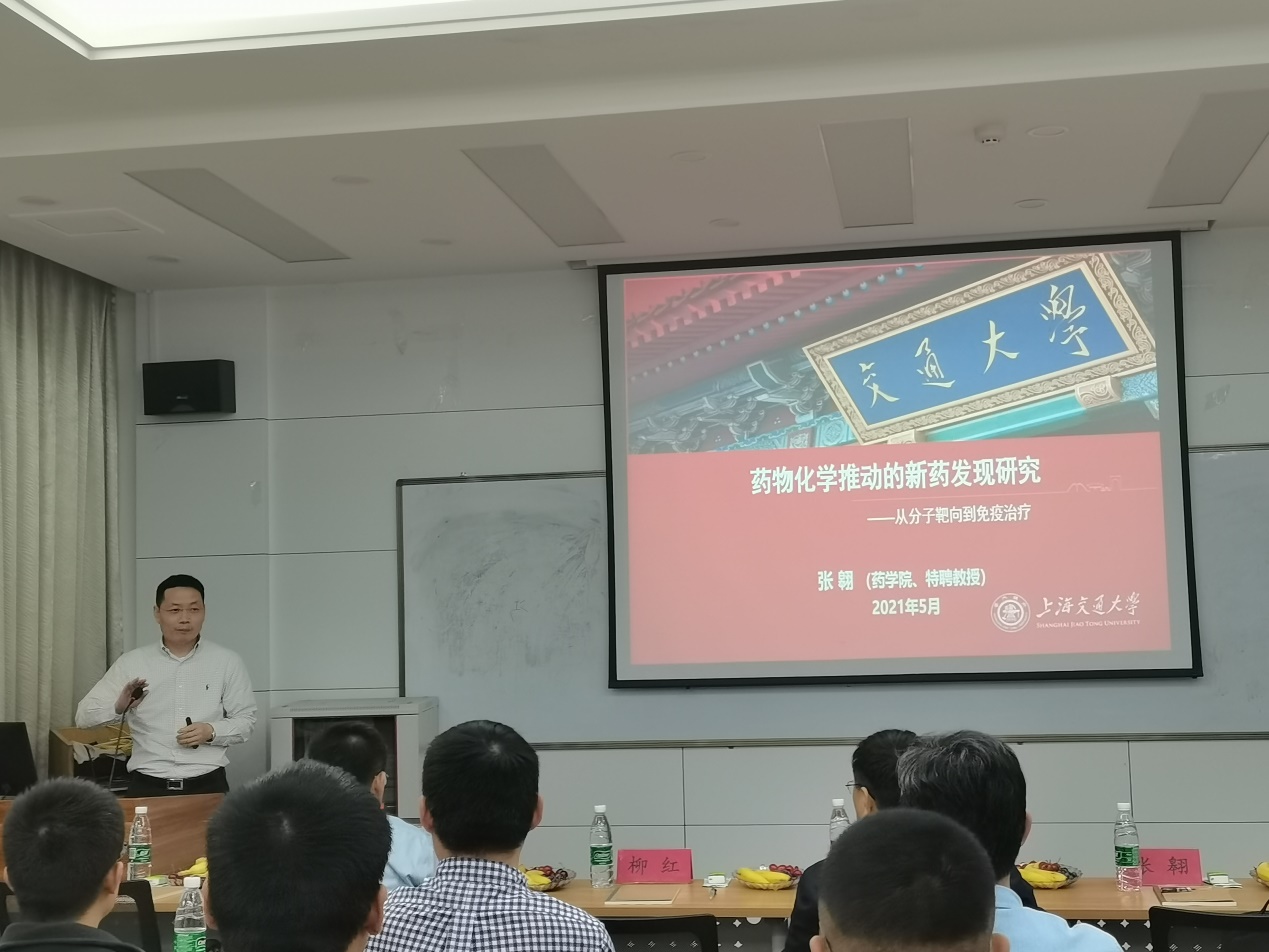 张翱教授的报告题目为“分子靶向抗肿瘤药物研究的实践与思考”。他以“药物化学推动的新药发现研究——从分子靶向到免疫治疗”为题,从以下三个方面介绍了自己课题组的代表性工作:妇女儿童孤儿疾病靶向药物研究(软巢癌、儿童髓母细胞癌、甲状腺突眼症)、中国人群高发恶性肿瘤靶向药物研究(肺癌、胃癌、肝癌、血液瘤)、靶向先天免疫治疗难治性肿瘤药物的药物研究(胰腺癌、淋巴瘤、直肠癌)。张翱教授从基于基于靶标的药物研究出发,指出此类药物研究方法面临的瓶颈,引出靶向固有免疫小分子药物研究的研究热潮。张翱教授的报告深入浅出的指出了抗肿瘤药物下一步的发展方向,呼吁新一代的年轻人抓住机遇、迎接挑战,使在座的各位都受益匪浅。