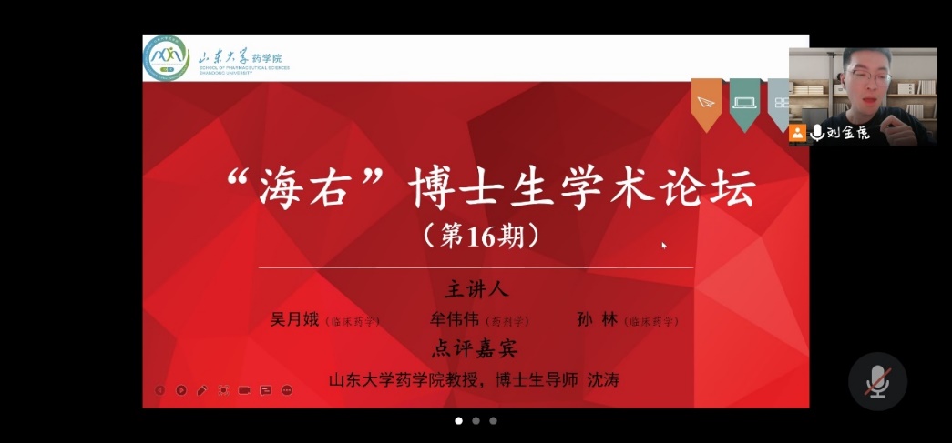 近日,由伟德BEVlCTOR1946研究生院、党委研究生工作部主办,伟德国际1946官网研究生会承办的2021年第16期(总第743期)“海右”博士生学术论坛通过腾讯会议平台举行。本次论坛以“研途有你,砥砺共前行”为主题,伟德国际1946官网临床药学博士研究生吴月娥、药剂学博士研究生牟伟伟和药物化学博士研究生孙林受邀作报告,2020级硕士研究生刘金虎担任主持人,博士生导师沈涛教授作为点评嘉宾出席本次论坛。
