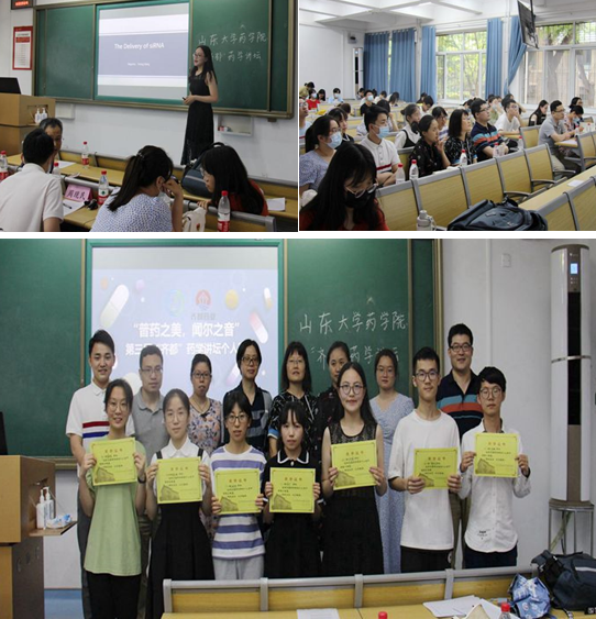 “齐都·药学讲坛”由齐都药业集团捐资设立,是基于培养员工自我学习和自我教育能力而开展的一项校企合作育人特色品牌实践活动。今年共有7名本科生参加比赛:李雅信以新冠肺炎疫情为切入点,从研发历程、作用机制和应用前景等方面对潜在有效药物瑞德西韦进行了详细且专业的介绍;曾丹从艾滋病的基本情况和用药状况入手,介绍了“鸡尾酒疗法”治疗艾滋病的优势、局限,未来艾滋病药物的使用以及研发展望;王艺铭从siRNA药物在美国上市讲起,用英语讲述了RNA技术的发展前景和药物递送入体内的研究瓶颈,并详细分析了基因药物的递送原理;叶邓辉讲述了自新冠肺炎疫情爆发以来,全球科研机构和药企研发对新冠疫苗的研发,介绍了现存新冠疫苗的类别和机制,并对辉瑞公司的mRNA疫苗进行了重点阐述;姜又琦将新型抗流感药物巴洛沙韦与传统抗流感药物奥司他韦进行对比,介绍了巴洛沙韦对抗流感病毒的新机制;张孝英从人们对砒霜作用的误解切入,结合砒霜及其部分衍生化合物的性质,对砷剂的毒理机制及抗癌作用做出了解释;龚孝笑则分析了全国新冠疫苗的接种态势并对免疫屏障的构建进行讲解。