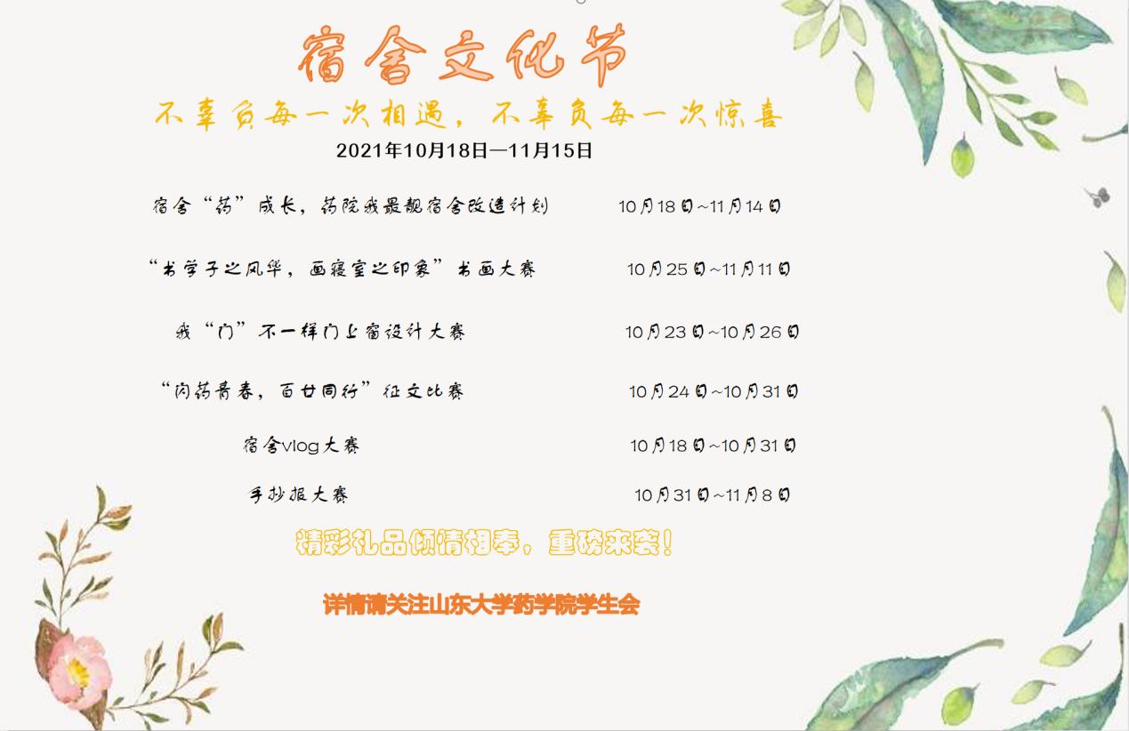 10月至11月期间,伟德国际1946官网面向全体本科生成功举办宿舍文化节系列活动。在丰富同学们校园生活的同时,也营造了良好的宿舍学习氛围,激发了员工对药学专业的学习热情。