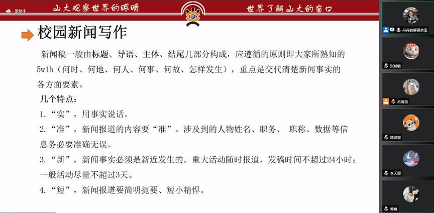 张丹丹结合自己工作经验,围绕新闻发现与策划、新闻写作、新闻摄影三个方面展开介绍。针对校园新闻的特点,她指出要在找准宣传角度的基础上以更快的报道速度、更高的专业素养、更强的新闻敏感性来发现策划有吸引力的好新闻。在校园新闻写作方面,她重点介绍了新闻稿的构成和特点,通过举例讲解如何进行新闻稿写作,并分享了包括标题、导语、主体、结尾在内的新闻写作技巧,强调在新闻稿书写过程中需要注意即时性、准确性与严肃性。最后,张丹丹从一般会议和风景摄影两个角度介绍了摄影的构图技巧以及注意事项。