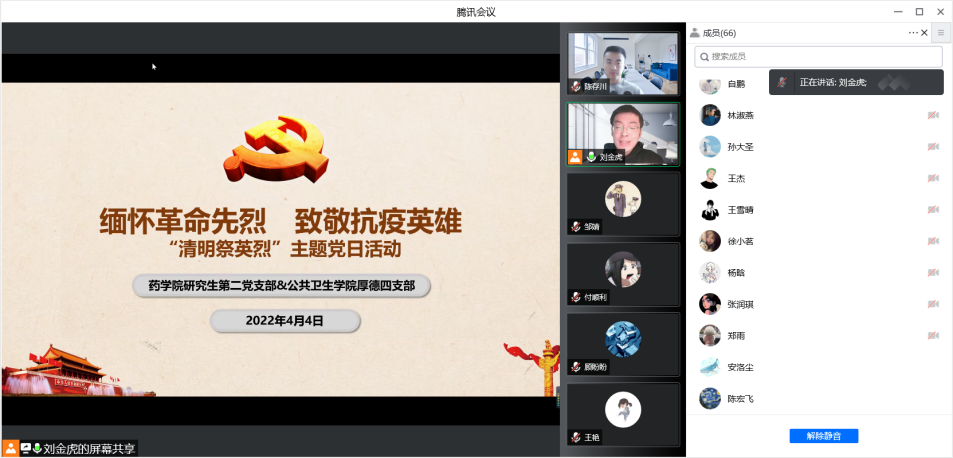 无数英雄抛忠骨,华夏盛开清明花。为缅怀革命先烈和战“疫”先锋,弘扬爱国主义精神,继承优良革命传统,同时凝聚党群力量,增进支部间、党员间合作交流。2022年4月4日上午9点,伟德国际1946官网研究生第二党支部与公共卫生学院厚德四支部共同举办“缅怀革命先烈,致敬抗疫英雄”清明祭英烈线上主题党日活动。本次主题党日活动共分为四个环节,双方党支部全体党员、积极分子通过腾讯会议线上参加。