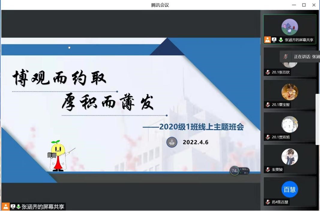 近日,2020级药学1班通过腾讯会议举办“博观而约取,厚积而薄发”主题云班会。副经理沈涛、班主任刘秀美和辅导员刘晓燕出席会议,会议由班长张涵齐主持。
