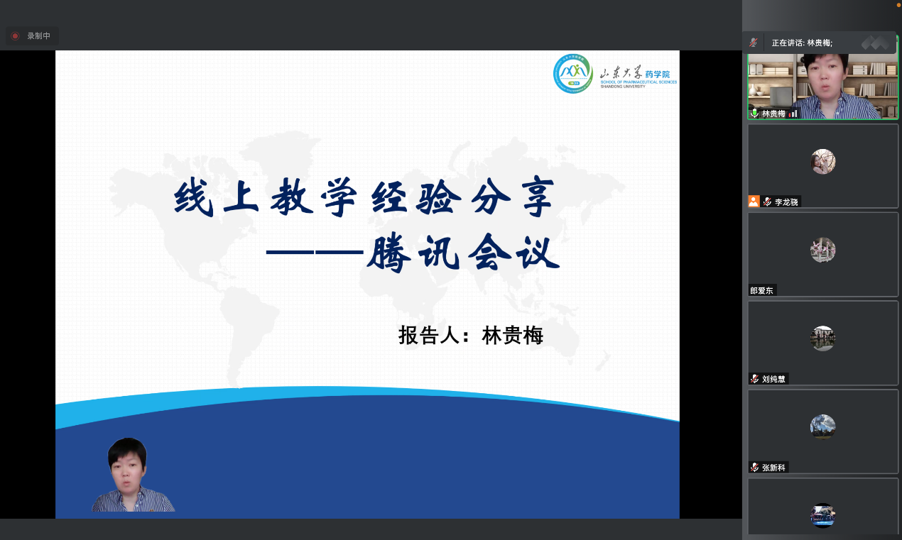 林贵梅副教授以《线上教学经验分享—腾讯会议》为主题,从“六要六不要”入手,演示了腾讯会议“画中画”“签到”等功能,从“课前预习”“课中练习”“课后复习”“辅导答疑”等方面分享了如何做好一堂线上课的设计,从如何更好做到“强化互动、精心设计”的要求,实现节节有设计、堂堂有思政,分享了她在物理化学教学中的做法。