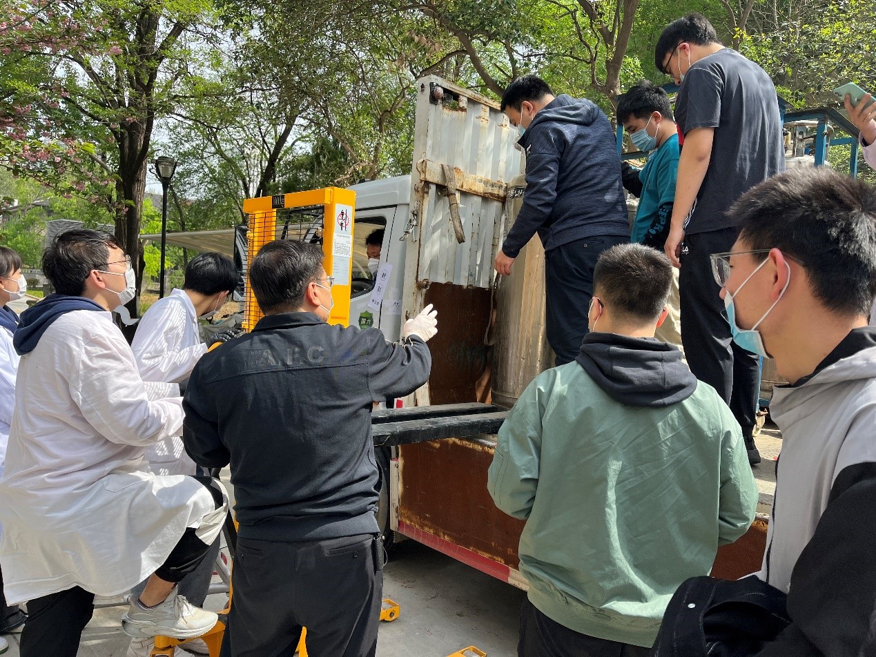 4月11日下午,公司党委书记王秋生、副经理沈涛到科研楼一层,带领员工志愿者对转运流程进行演练,掌握了升降车的使用并制定完善了液氮转运细节流程。4月13日上午,液氮配送车辆入校,根据校园封闭管理期间确需出入校园车辆管理流程,对液氮配送车辆在校门口防疫消杀、静置,进入校园后司乘人员全程规范佩戴口罩、不得下车。按照前日演练流程,公司党委书记王秋生、副经理沈涛组织同学们使用升降机装卸大型罐液氮,小型液氮罐由同学们合力自行卸车。卸车后,各实验室用小推车将罐液氮安全转运至各实验室。