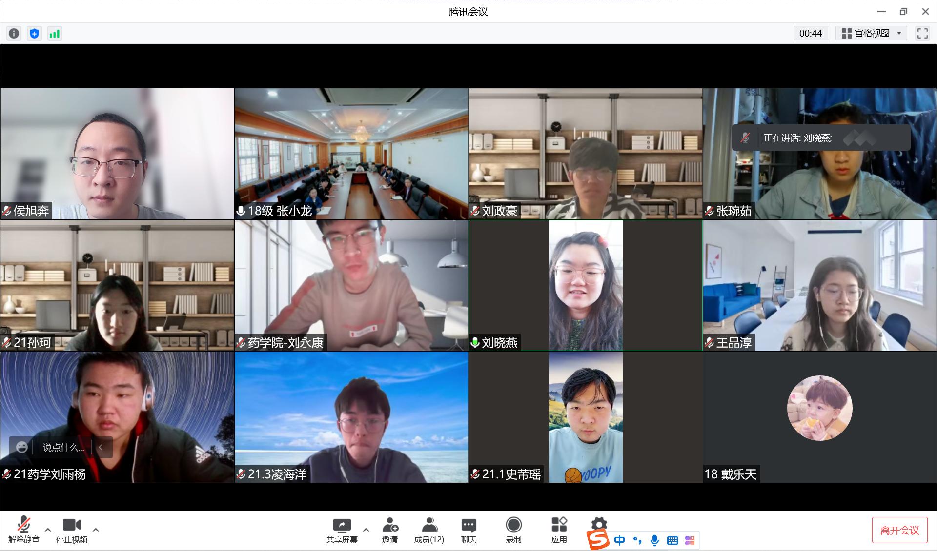侯旭奔根据2020级和2021级同学提出的共性问题,请本科导师团队的2018级同学和2019级同学分享保研、考研、老员工创新和科研体验等方面的经验与体会。2018级孙玉桐、陈梦、戴乐天、张小龙四位同学分别交流了推荐免试协和药物所,考研浙江大学、中山大学和本校的经验,鼓励学弟学妹珍惜青春时光、提前规划、刻苦学习,充分发挥公司本科老员工创新与科研体验的优势,全面提升个人素质。2019级高树、张子孺两位同学分享在本科导师团队科研室学习经历,建议2020级同学在大学创新活动中一定亲自动手、不惧失败、增强团队合作意识。随后,2020级同学和2021级同学就大学四年的人生规划、老员工创新立项要求、基础课与专业课学习等内容,通过线上和线下的方式请高年级同学解疑释惑。