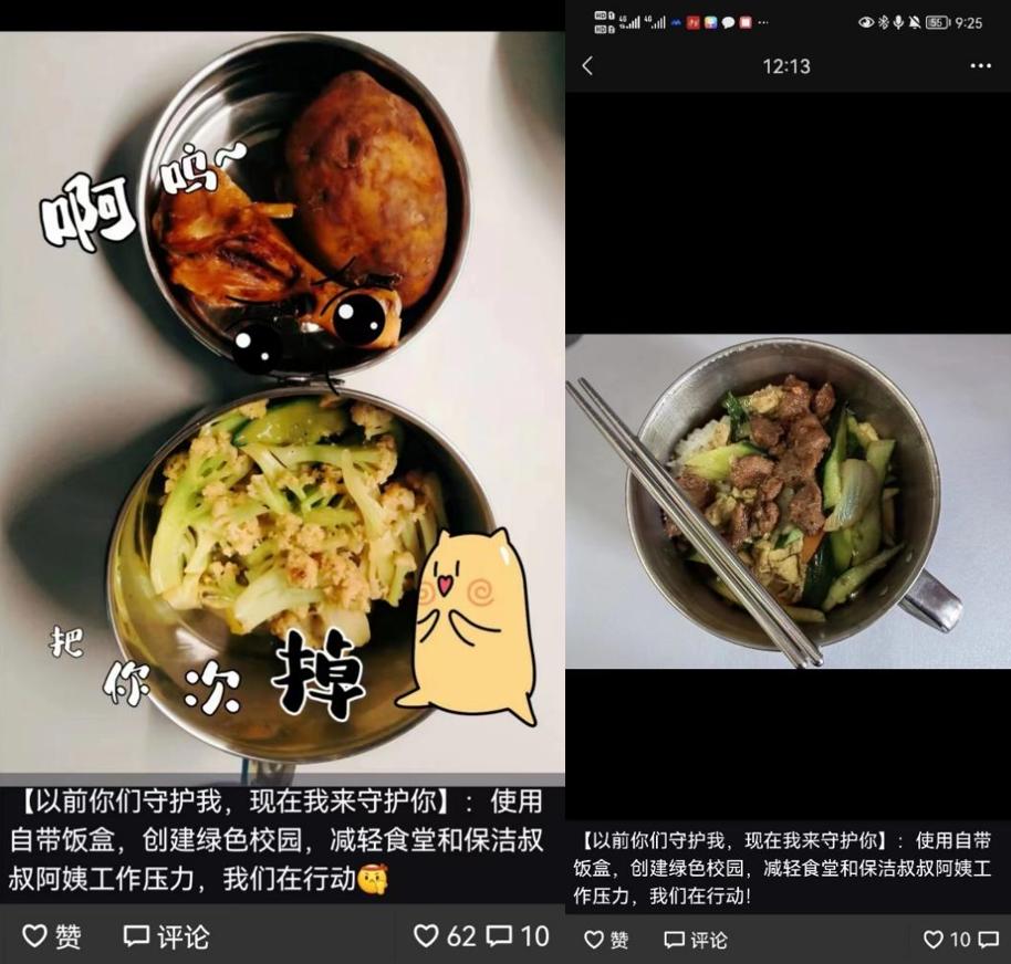 “使用饭盒,守望相助”,封控以后,食堂暂停堂食,师生外带餐食造成白色垃圾大量堆积,一方面给自然环境带来危害,同时保洁人员工作难度大、疫情传播风险加大。为大力弘扬勤俭节约传统美德,研究生第五党支部及时号召开展“使用饭盒,守望相助”活动,以减少环境污染和食物浪费,形成简约适度、绿色低碳生活新风尚。支部通过公众号呼吁全院同学使用饭盒,受众面累计达500人次,此外,支部党员通过微信朋友圈积极宣传使用饭盒情况,带动周围同学自带餐盒,凝聚良好的氛围,展现党员风采。