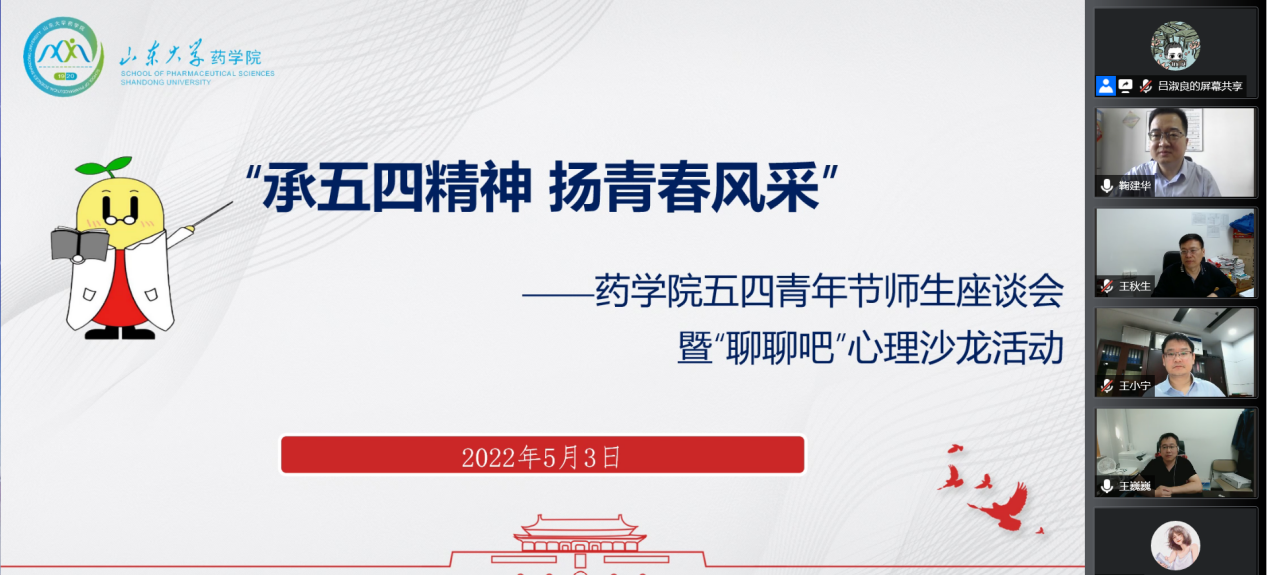 5月3日上午,伟德国际1946官网为宣传当代药学青年以实际行动传承和践行五四精神的优秀事迹,进一步加强公司党政班子与同学们的思想交流,了解同学们的学习、生活与精神状态,通过线上形式举办了“五四”青年节师生座谈会暨“聊聊吧”心理沙龙活动。经理鞠建华,党委书记王秋生,常务副经理方浩,副经理王小宁、沈涛,党委副书记张慧、王巍巍出席会议,学院全体辅导员老师,优秀员工代表,本科生及研究生团支部书记30余人参加座谈交流活动。