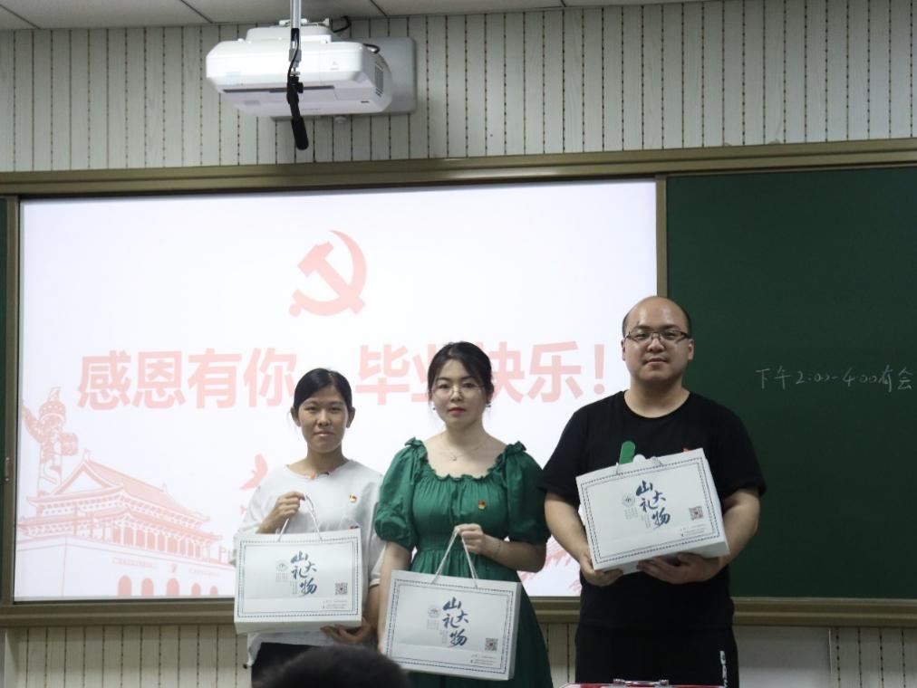 最后,党支部为每位毕业生党员送上了精心准备的极具山大特色的毕业纪念品。为毕业生准备留有山大印记的毕业纪念品是研究生五支部一直以来的支部特色,努力成为有温度,有情谊的党支部也是五支部作为样板党支部“有情谊”的建设特色。收到礼物,毕业生纷纷表示惊喜与感动。邵利伟同志感动地说:感谢支部的关怀,希望师弟师妹科研顺利,支部越来越好!
