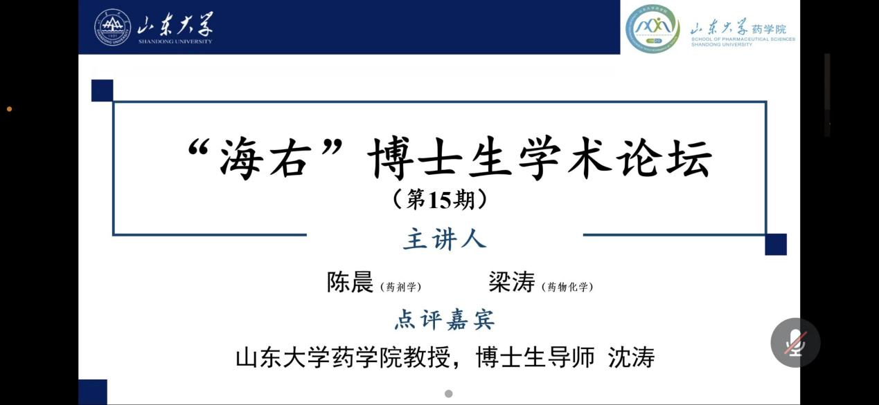 2022年6月9日,由伟德BEVlCTOR1946研究生院、党委研究生工作部主办,伟德国际1946官网承办的2022年第15期(总第778期)“海右”博士生学术论坛通过腾讯会议平台举行。本次论坛属于优秀博士毕业生毕业报告月活动,2018级药剂学博士研究生陈晨和2019级药物化学博士研究生梁涛受邀作报告,2021级硕士研究生傅姝萌担任主持人,博士生导师沈涛教授作为点评嘉宾出席本次论坛。