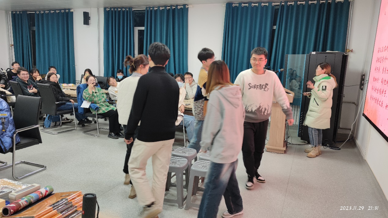 团结合作,凝聚集体建设“向心力”。2023级科硕班和2023级专硕1班运用分组游戏和比赛积分形式开展比拼,“听歌识曲”“我爱记歌词”“猜猜我是谁”“抓鸭子”“你划我猜”“抢凳子”等游戏妙趣横生,增进同学友谊。同学们热情高涨,默契配合,现场气氛活跃。在自由活动时间,同学们讨论游戏收获,彼此分享生活日常,倾诉学习压力,交流科研想法,拉进彼此距离。这为同学们提供了放松身心、释放压力和结交朋友的机会,让同学们在游戏中培养互信合作的意识,提高抗压能力,更好地应对学习和生活中的挑战。