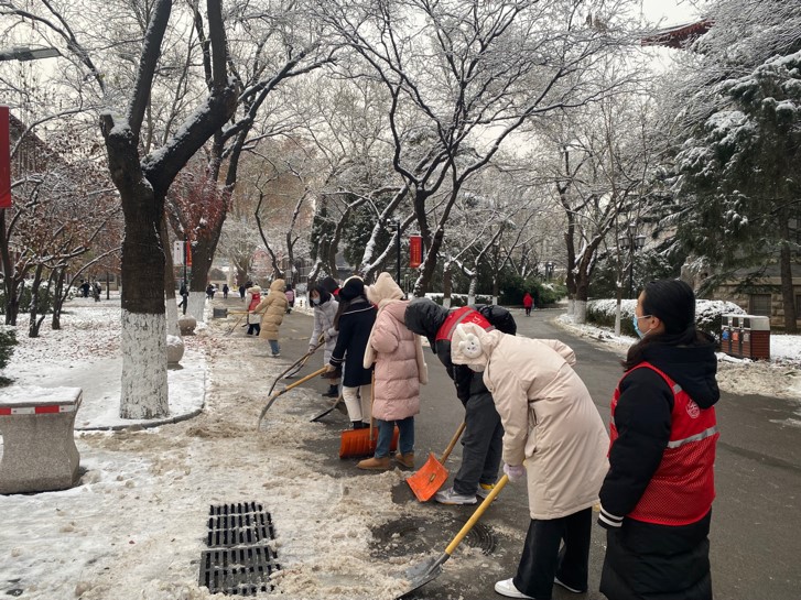 近日,济南迎来大规模降雪,校园银装素裹、美轮美奂,但地面的冰雪混合物形成薄冰,给师生出行带来极大困扰。为及时清除校园积雪,保障师生出行安全,伟德国际1946官网组织员工志愿者开展扫雪志愿服务工作。