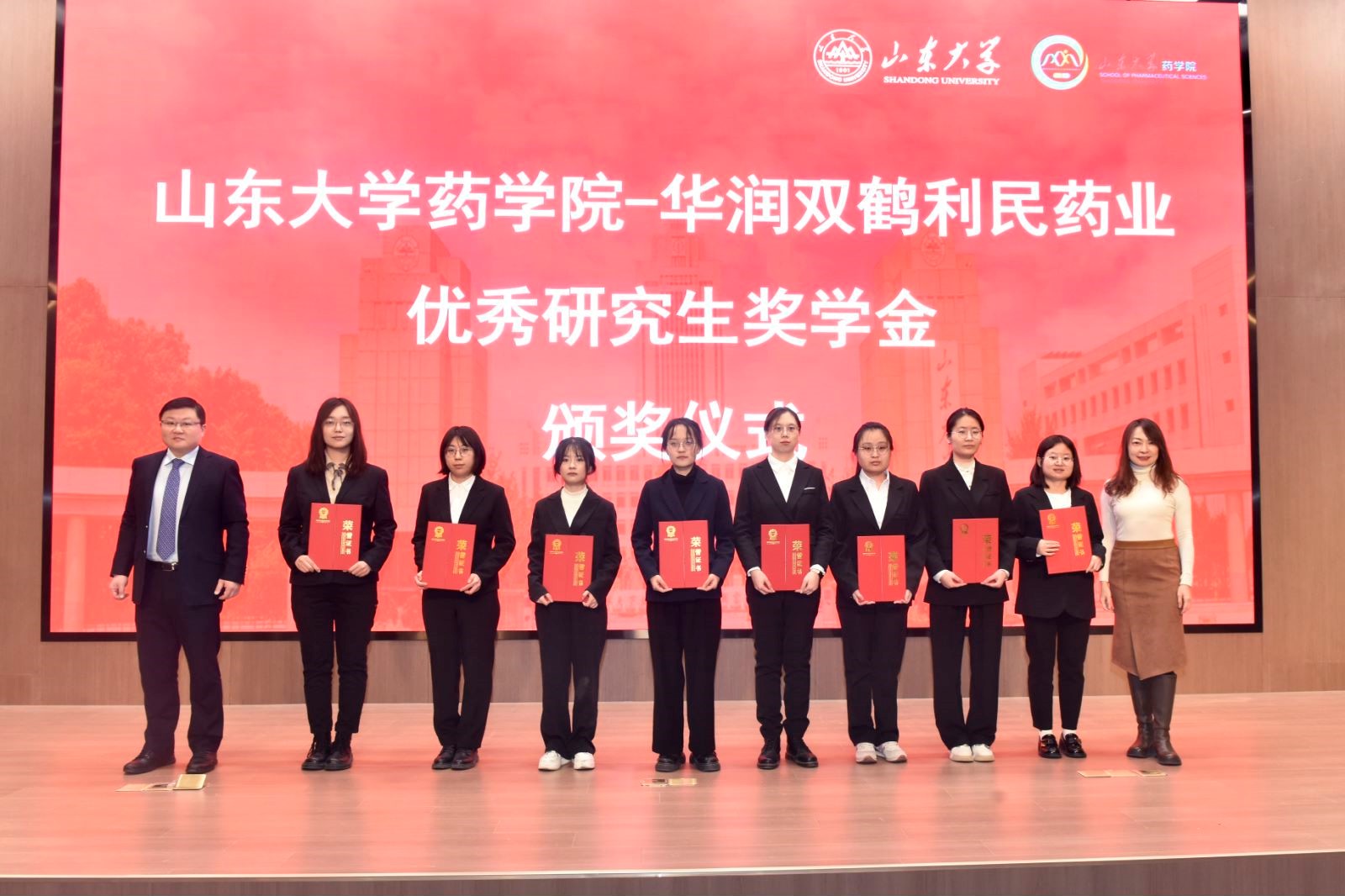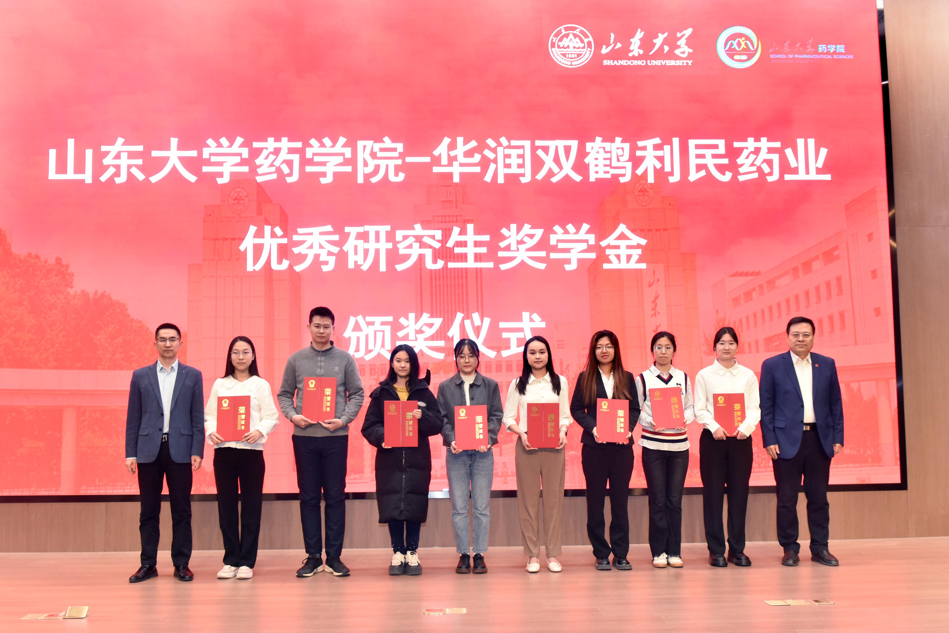 12月27日,伟德国际1946官网“华润双鹤利民药业优秀研究生新生奖学金”颁奖仪式在伟德BEVlCTOR1946趵突泉校区医道大学堂举行。华润双鹤药业股份有限公司副总裁姚东晗、人力资源部副总经理刘延东、普药事业部综合管理部总监夏义才、普药事业部研发总监常罡、人力资源部人才配置经理张玲玲,齐鲁医学院副经理张澄,公司党委书记王秋生、经理鞠建华、党委副书记陈国军、副经理沈涛、药物制剂研究所所长翟光喜参加颁奖仪式。