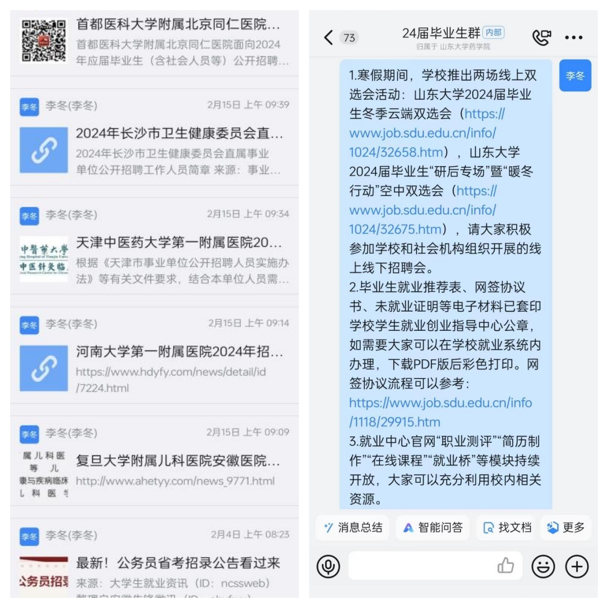 做有温度的就业服务。寒假期间,毕业生辅导员及时精准推送就业信息,随时帮助毕业生解决求职就业中的“急难愁盼”问题,积极组织未就业毕业生参加线上双选会、线上直播带岗、就业指导等线上就业活动,确保毕业生在假期求职有渠道,就业有岗位。2024届毕业生张涵齐提到:“寒假期间,学院不间断提供就业信息推送、组织相关活动提升就业技能,我深切感受到了学校和学院对毕业生的关心和支持,也学到了许多求职技巧和面试经验。”